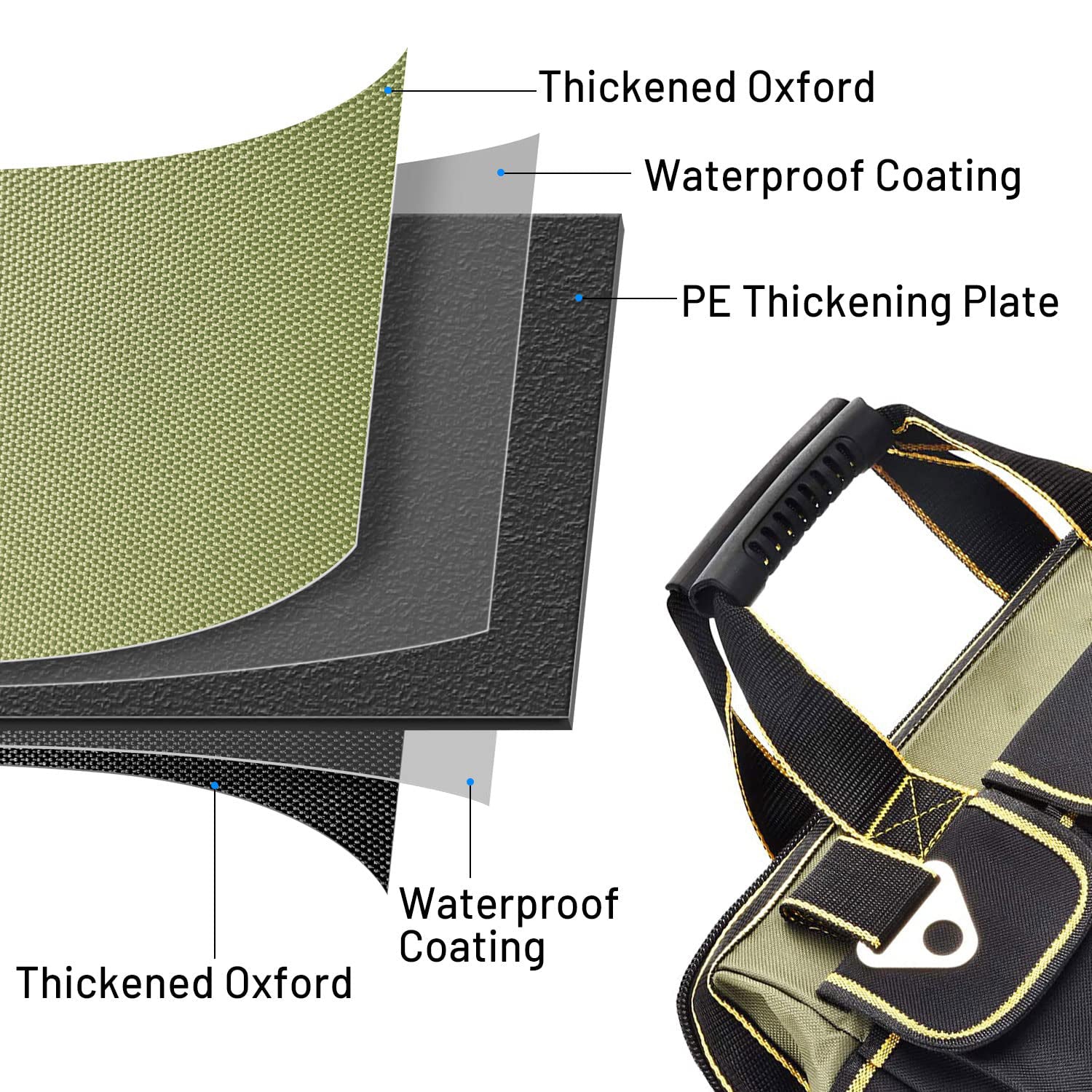 - 【Sturdy and Durable】- The tool bag is made of high-quality Oxford cloth (five-layer synthesis: Oxford cloth, waterproof layer, PE thick plastic board, waterproof layer, Oxford cloth) and reinforced with a PP plastic waterproof base, providing superior toughness, strength, resistance to dirt, and long-lasting durability, making it suitable for use in various harsh working environments.